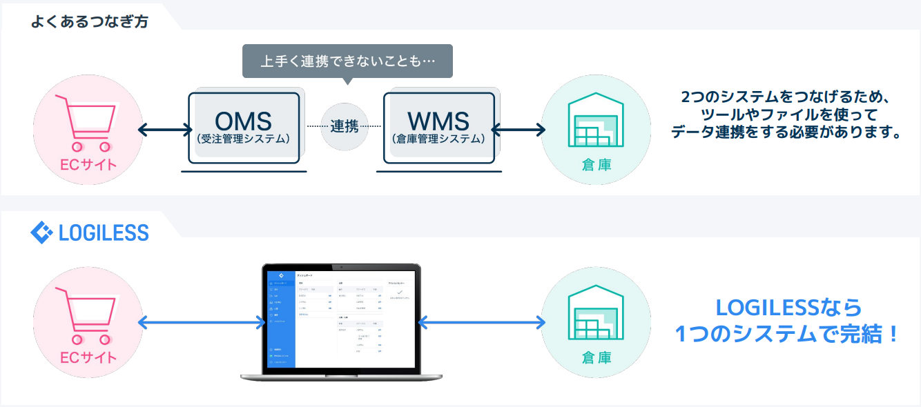 一般的なEC物流システムでは、OMSとWMSが別々のシステムとして提供されており、2つのシステムをつなげるために、ツールやファイルを使ってデータ連携をする必要があります。