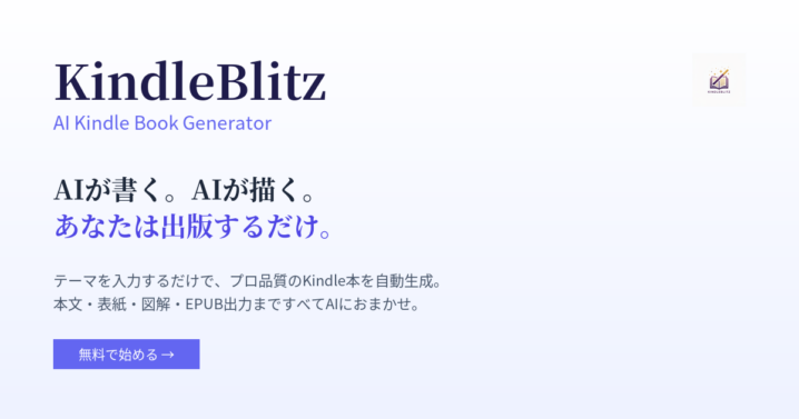 KindleBlitzは、AIの力で誰でも簡単にKindle電子書籍を作成・出版できるオールインワンプラットフォームです。テーマを入力するだけで、タイトル提案・章構成・本文執筆・表紙デザイン・図解イラスト・EPUB/DOCX出力まで、出版に必要な全工程をAIがサポートします。